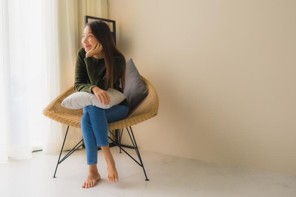Lass eine Akzentfarbe mindestens dreimal auftauchen: Kissen, Vase, Lesezeichenhalter. Wiederholung beruhigt das Auge und wirkt durchdacht. Verrate uns, welche drei Spots du einsetzen würdest.